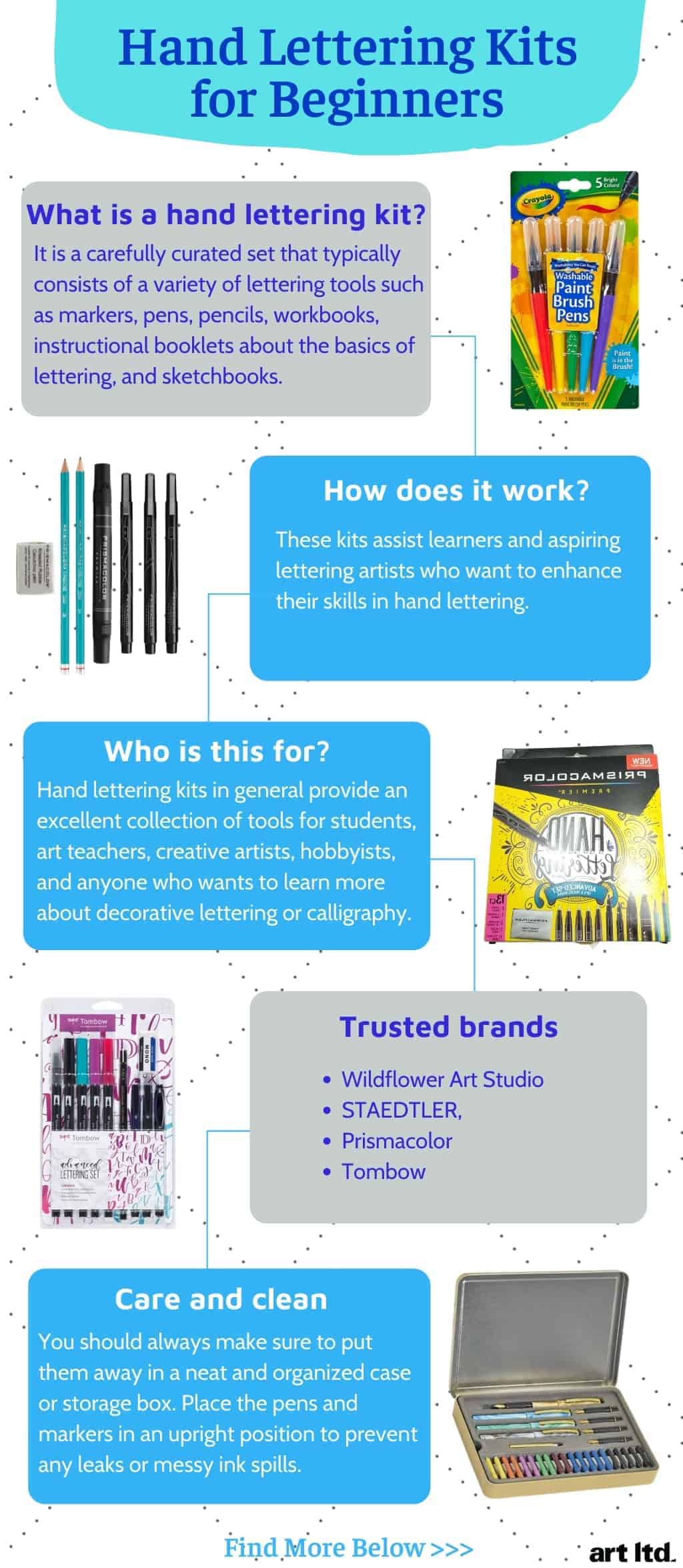 通常,初学者集包括不同类型的书法笔、彩色或黑色标记,刷笔。一些品牌也可能提供刻字工作表和活动的集合训练,帮助学生练习他们的技巧。